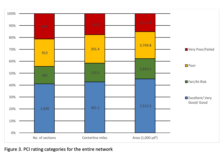 A very large number of road sections — 1,763, covering 352 miles — had PCI scores below 50, and will be very expensive to repair.