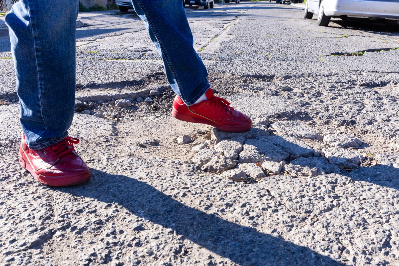 Given that Soll works in construction, we asked him what he thought about the city patching roads instead of fully reconstructing them. He said the cold-patch asphalt that is frequently used can help, but it doesn’t last. He said a large pothole near his girlfriend’s house on Fruitvale was cold-patched, but a month later, the hole came back.