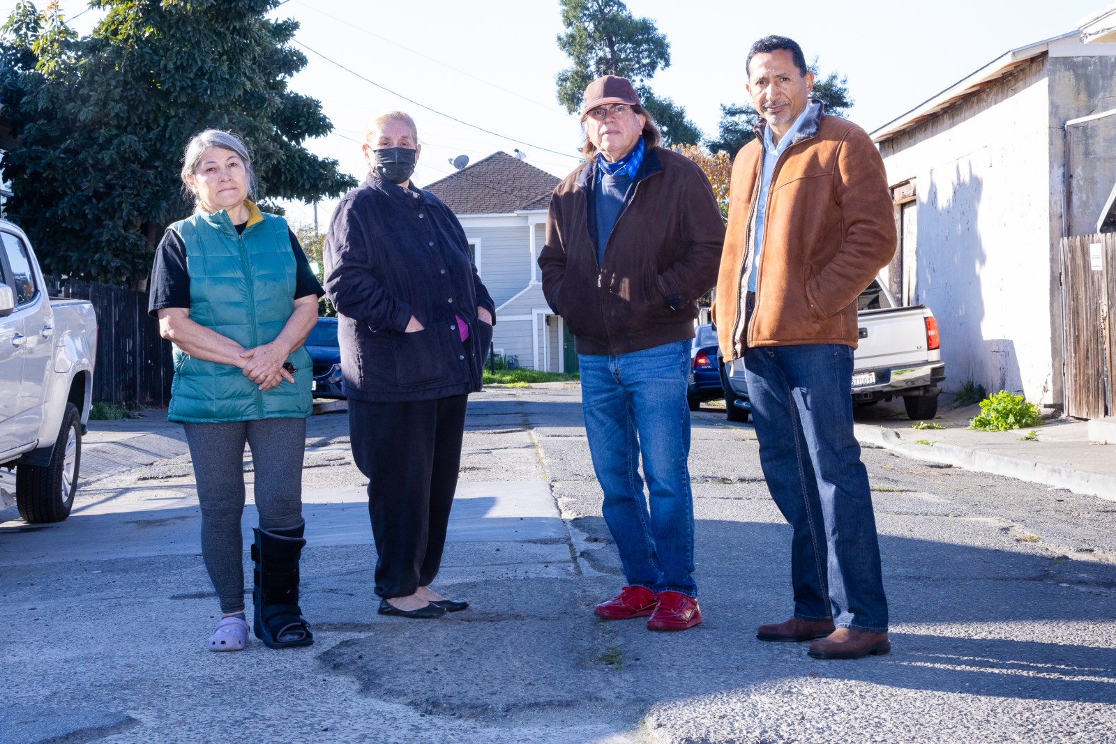 From left to right, Maria de los Ángeles Covarrubias, Ofelia Martinez, Salvador Perez, and Ricardo Rojas stand on uneven pavement on the street where they live, Rosedale Avenue, on Dec. 13, 2025. They all expressed frustration over their busted up street. Credit: Estefany Gonzalez for The Oaklandside