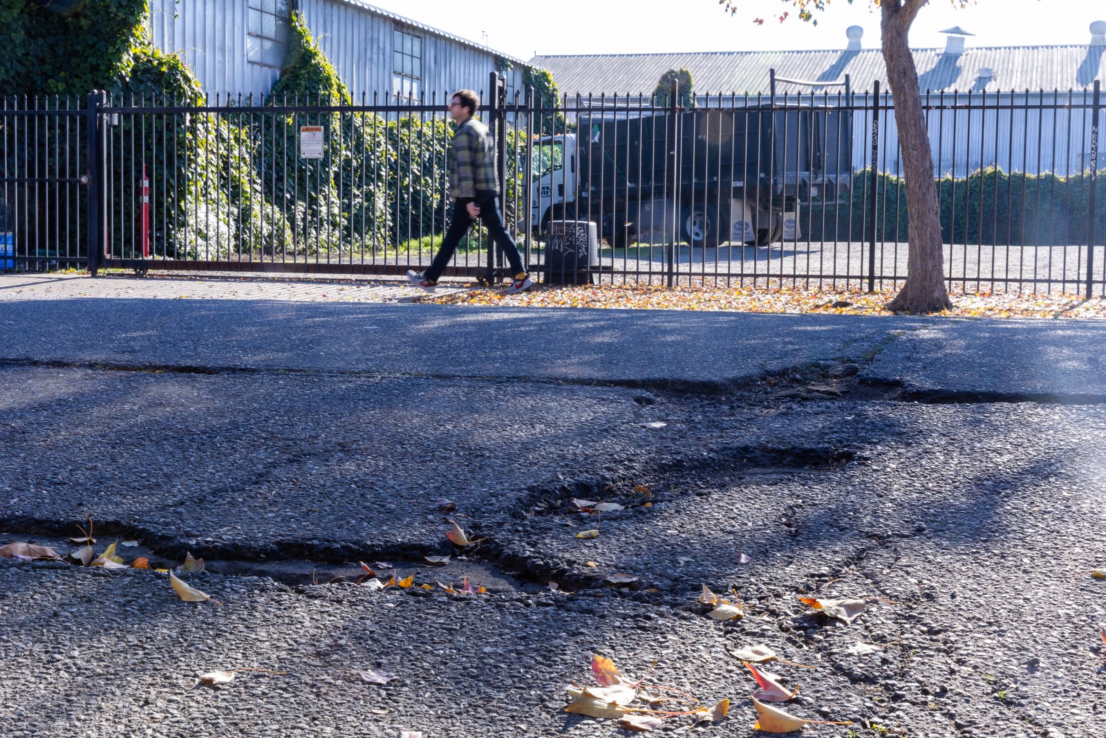 A pedestrian walks past several cracks in 24th St. on Dec. 13, 2025. A city paving survey found this West Oakland street was among the 11 worst in all of Oakland. Credit: Estefany Gonzalez for The Oaklandside