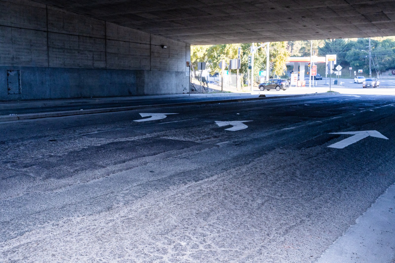 Potholes are visible on Golf Links Road, Dec. 13, 2025. Thousands of people use this distressed stretch of road to get onto and off the highway, to reach schools nearby, and to visit the Oakland Zoo. Credit: Estefany Gonzalez for The Oaklandside