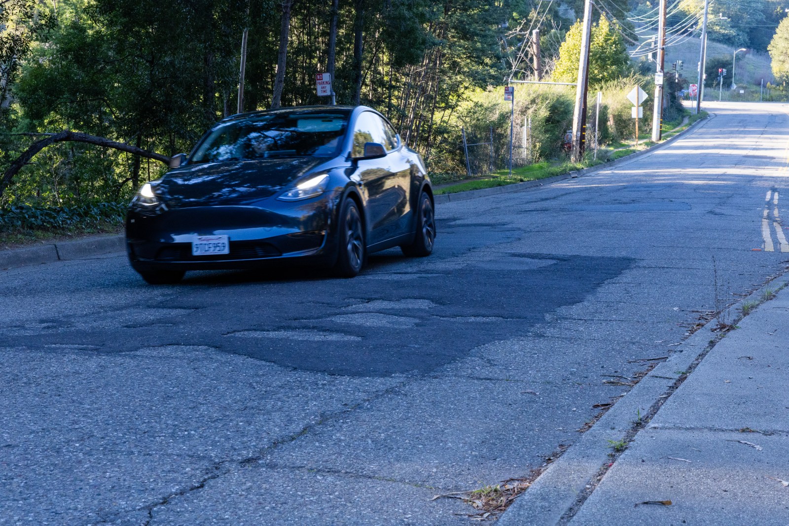 A car drives down Monterey Boulevard, Dec. 13, 2025. Parallel to Highway 13, this road suffers from poor maintenance and from its location, as it sits partially atop the Hayward Fault. Credit: Estefany Gonzalez for The Oaklandside