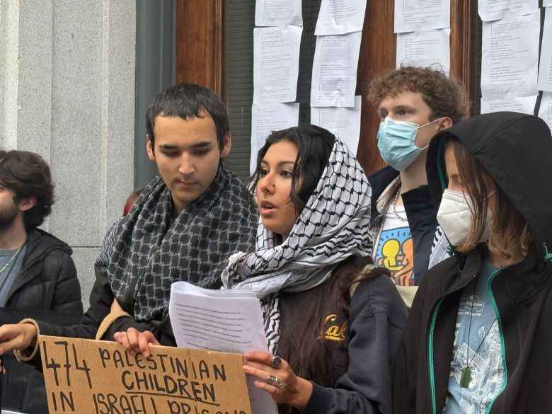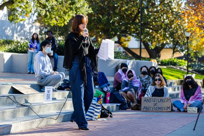 Students read from a petition in support of Peyrin Kao, a UC Berkeley lecturer suspended for discussing the war in Gaza in the classroom, outside California Hall. Credit: Felicia Mello/Berkeleyside Credit: Felicia Mello/Berkeleyside