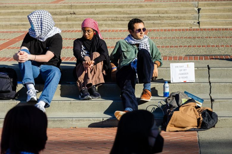 Stephen Okita, right, a student on a hunger strike, listens to speakers speaks during a student teach-in at UC Berkeley on Dec. 11, 2025 in support of Peyrin Kao, a computer science lecturer suspended from teaching after sharing pro-Palestinian views in his classroom. Credit: Estefany Gonzalez for Berkeleyside