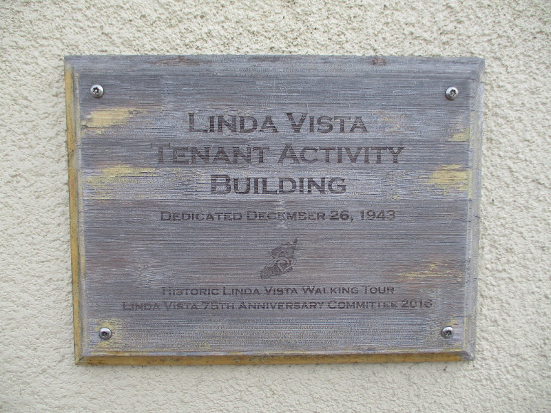 The Linda Vista Tenant Activity Building was dedicated on December 26, 1943 and stood at the center of the federally constructed Linda Vista Housing Project. The project provided 3001 dwelling units for aircraft and shipyard defense workers in San Diego during the war.