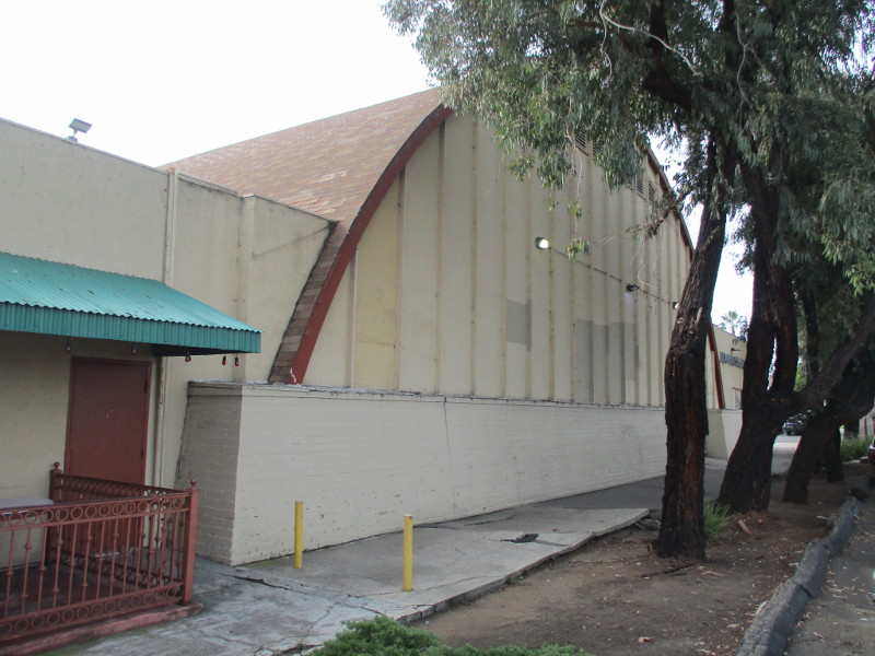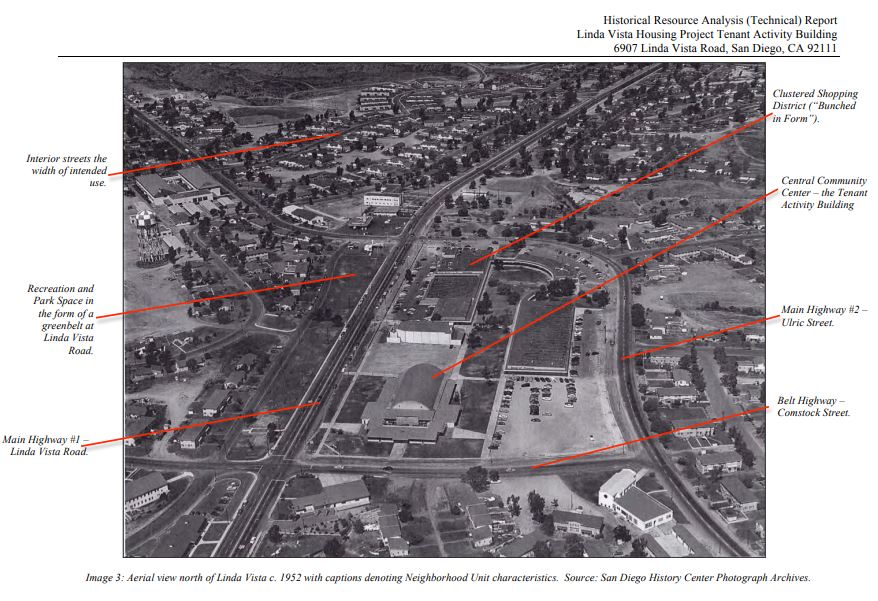 Here’s a circa 1952 aerial view of the Linda Vista House Project and its Tenant Activity Building from the report. The center of the building with its high barrel roof today provides a perfect, roomy space for roller skaters at Skateworld.