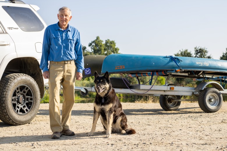 Richard Sloan and his dog, Lily, stand next to their canoes near the San Joaquin River. Credit: (Diego Vargas / Fresnoland)