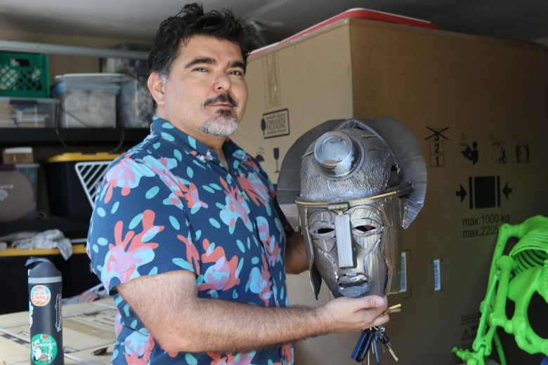 Roque Rodriguez, co-founder of Fresno’s Swede Fest, poses with a homemade prop from a sweded trailer for the Netflix series “Barbarians.” Rodriguez and friends did the project with Netflix, leading a team of other video producers from around the world on the art of sweding. Credit: Julianna Morano | Fresnoland