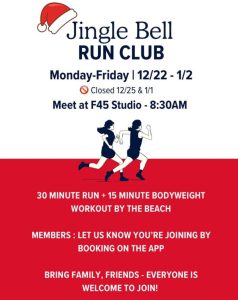 While the space is closed, F45 remains committed to the community. The Coronado F45 free Jingle Bell Run Club will meet every morning during the closure at 8:30 am, except on 12/25 and 1/1. Members can book on the app for a 30-minute run followed by a 15-minute body circuit on the beach. Non-members are also welcome to join the Jingle Bell Run Club.