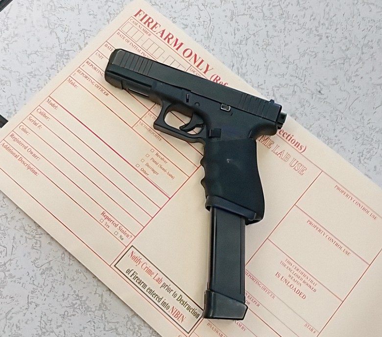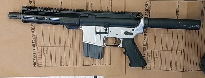 (L-R) An automatic pistol with an extended magazine and an assault rifle seized during the service of a search warrant and probation search on the 900 block of Ellsworth Street in San Francisco, Calif., on Wednesday, Oct. 29, 2025. (San Francisco Police Department via Bay City News)
