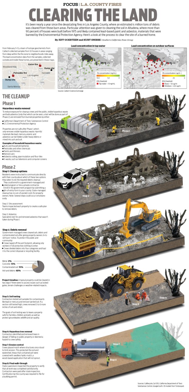 It’s been nearly a year since the devastating fires in Los Angeles County, where an estimated 4 million tons of debris was cleared from those burn areas. Particular attention was given to cleaning the soil in Altadena, where more than 90 percent of houses were built before 1975 and likely contained lead-based paint and asbestos, materials that were banned by the Environmental Protection Agency. Here’s a look at the process to clear the site of a burned home. (enlarge)