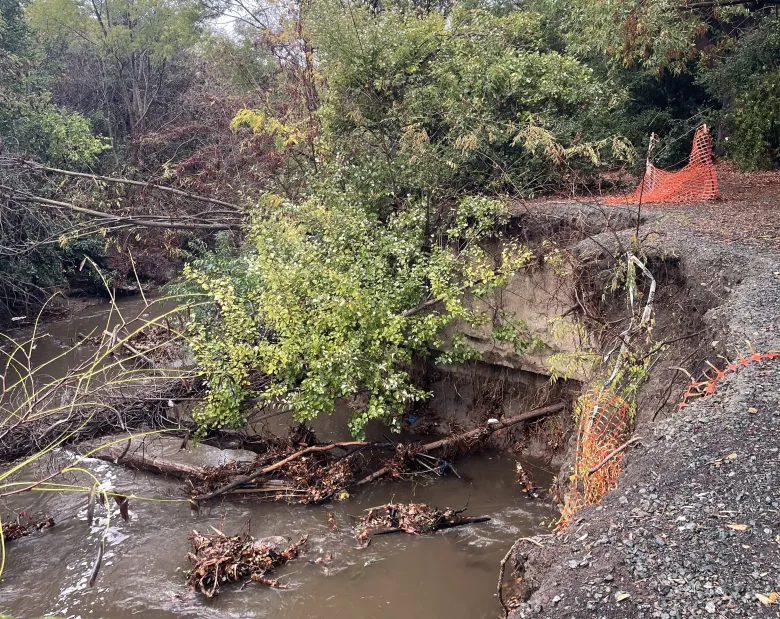 Erosion on Stevens Creek near the German International School of Silicon Valley collapsed a large portion of the creek bank, as seen on Nov. 13, 2025. Photo by Kevin Forestieri.