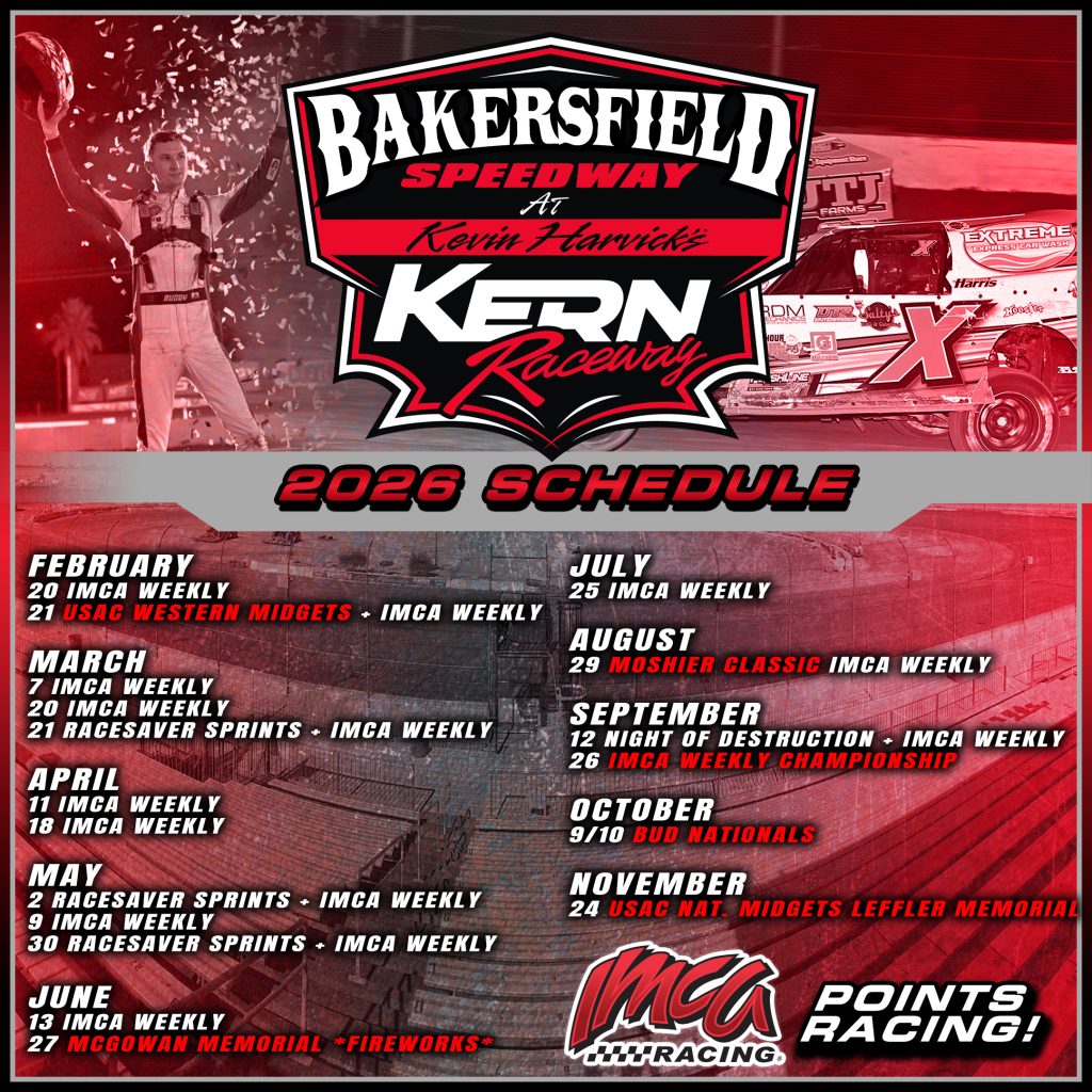 Bakersfield Speedway at Kevin Harvick’s Kern Raceway has announced its 2026 schedule for the 81st season of dirt track racing in Kern County. The schedule represents the second campaign for the combined efforts of promoters Tim Huddleston and Scott Schweitzer at the one-third mile dirt track located at Enos Lane and I-5.