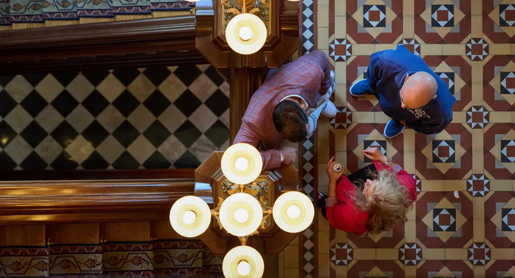 People chat together at the state Capitol in Sacramento on Sept. 12, 2025. Photo by Fred Greaves for CalMatters