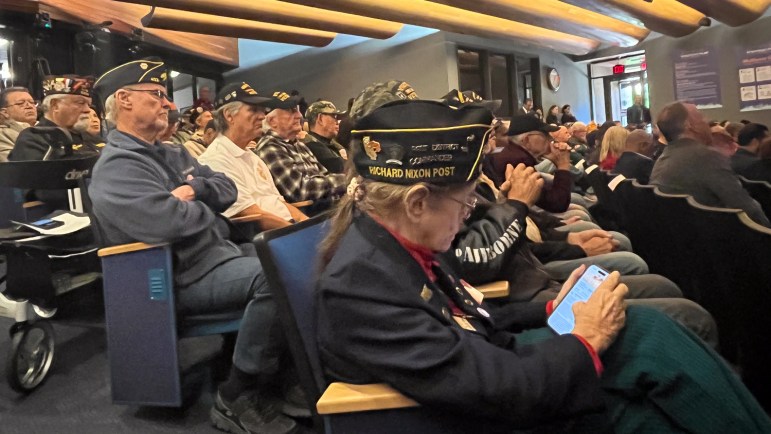 Local veterans fill the Anaheim City Council chambers, where state legislators held a hearing, to demand progress on OC’s first veterans cemetery. Nov. 21, 2025. Credit: NORBERTO SANTANA JR., Voice of OC