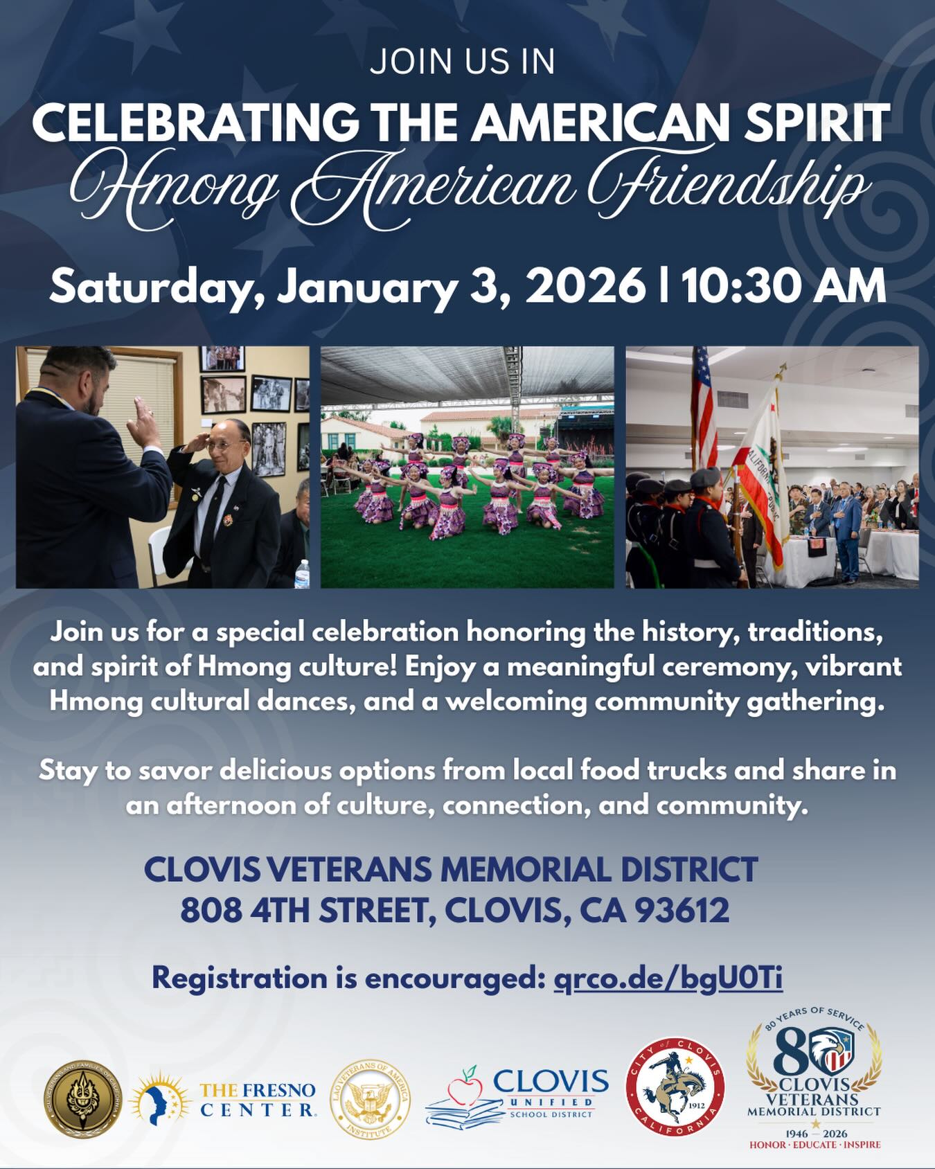 Celebrating the American Spirit: Hmong American Friendship is scheduled for Saturday, Jan. 3, 2026, at the Clovis Veterans Memorial District, located at 808 Fourth St. Community members are encouraged to arrive at 10 a.m., with the program beginning at 10:30 a.m.