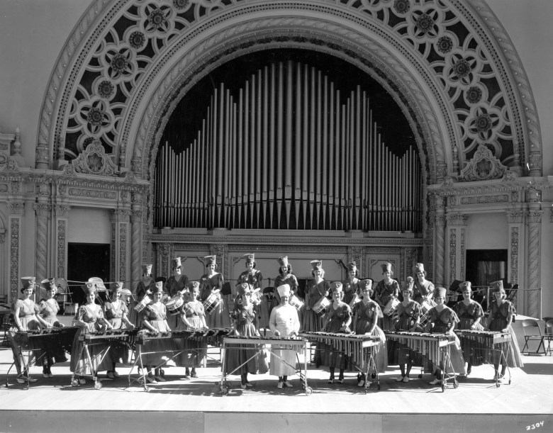 23 young women with drums and marimbas on stage at Spreckel’s Organ Pavilion; drums are labeled: “BEECHNUT GUM”, photo labeled: “AMERICA’S EXPOSITION / SAN DIEGO – CALIFORNIA / MAY 29th – NOV 11th, 1935″. Eighteen signatures on back: Maxine Richards, Ella, Clotilda Clearw[illegible], Irene Sanderson, Audrey Sheller, Mrs. C. D. Smith, Wanda Jensen, Genevieve Trent, Viola A. Graves, [illegible] D. Smith, Leona Hubbard, Arlene Mansfield, Joyce Mansfield, Lois Jensen, Gay Woodward, Frances K. Mehl, Gladys Albertieri, Mary Blackburn”. (Photo courtesy of San Diego History Center)