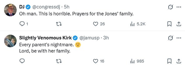 Taking to X, they wrote: ‘This is horrible. Prayers to the Jones’ family. ‘