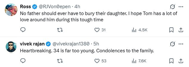 ‘Heartbreaking. 34 is far too young. Condolences to the family.’