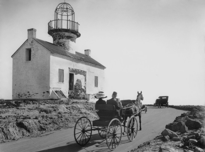 View of a man and a woman in horse drawn buggy on the road passing the US Upper Lighthouse at Point Loma in the 1910s. Two automobiles are parked further up the road. US Upper Lighthouse has also been called Old Spanish Lighthouse erroneously, as it was built in the American Period in the 1850s. (Photo courtesy of the San Diego History Center)