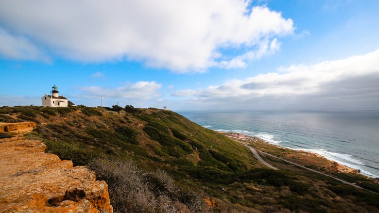 The Old Point Loma Lighthouse stands at the top of the peak, overlooking the Pacific Ocean to the right, as seen from a distance on the Bluff trail. The clouds are vast and puffy overhead. Photo taken near the restored WWII bunker. (Photo courtesy of U.S. National Parks)