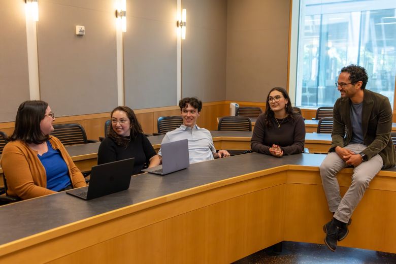 Hausman sits on a desk in a classroom during a discussion with the Deportation Data Project team. Credit: Sara Martin/Berkeleyside