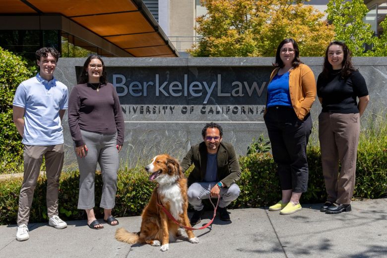 Members of the Deportation Data Project team — Alexander Stratton, Elena Gonzalez, Berkeley Law professor David Hausman (and his dog, Ernie), Claudia Liss-Schultz and Lorena Ortega Guerrero — stand outside UC Berkeley School of Law. Credit: Sara Martin/Berkeleyside