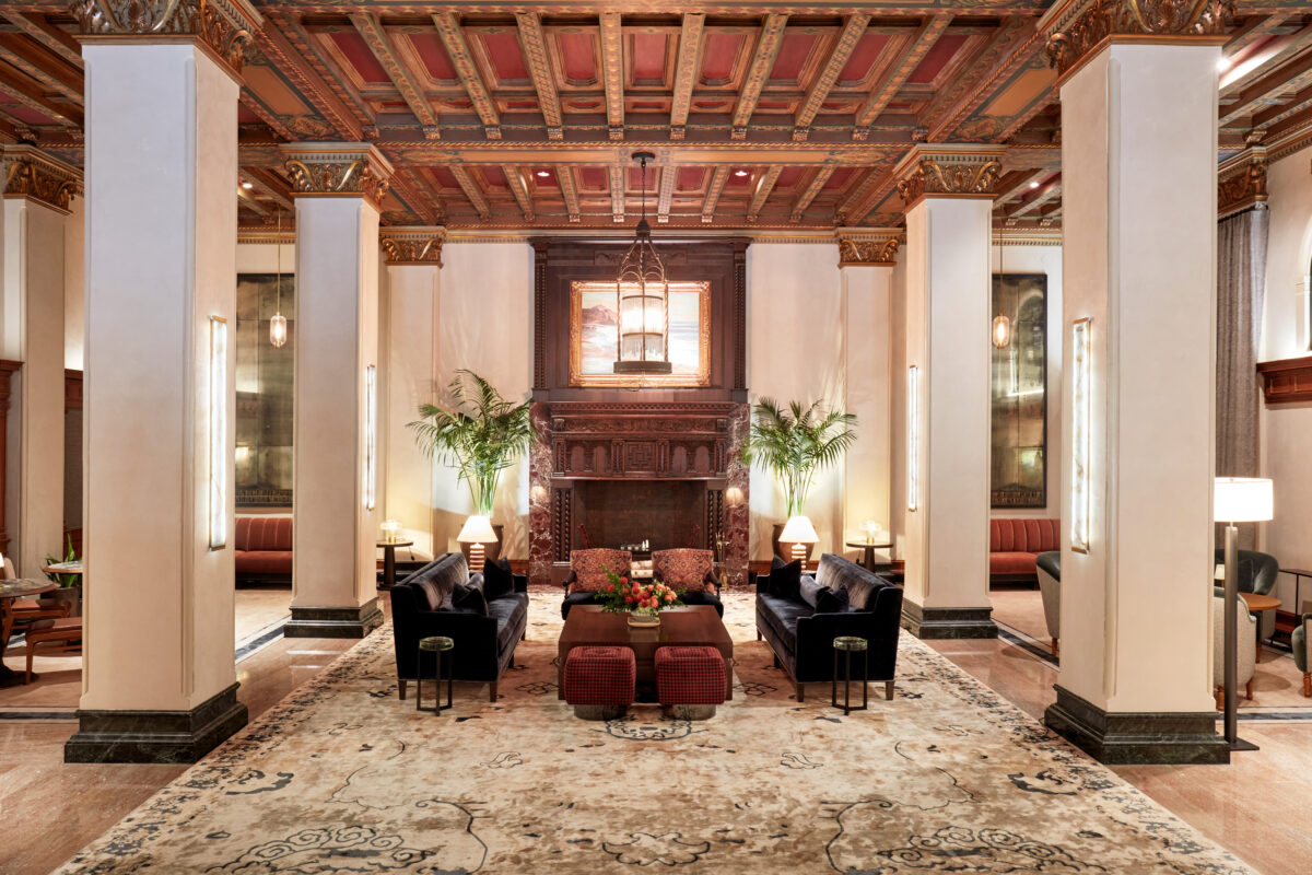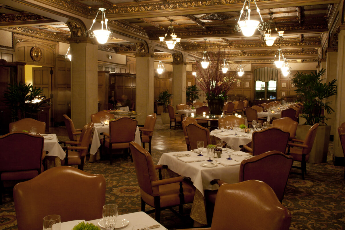 Luxurious meeting spaces, hotel rooms, entertainment pavilions, a library, pool and even a barber shop share space under magnificent stenciled, gilded and coffered ceilings. Keep an eye out for the recently uncovered Batchelder art tiles in the dining room.