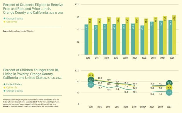 When accounting for cost of living, family resources and social safety net benefits, the child poverty rate in Orange County hit 14.5%, exceeding the state child poverty rate of 13.8%, the report said.