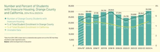 In the 2023/24 school year, 6.7% of O.C. students “experienced insecure housing,” higher than the 5.2% in 2014/15.