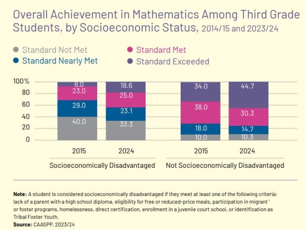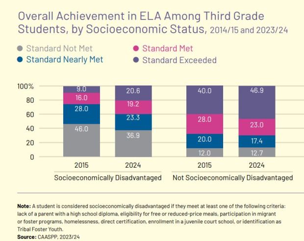 Silver lining: Over a decade, the percentage of economically disadvantaged students who met or exceeded academic standards jumped from 25% to 39.8%.