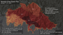 Overview showing a timeline of the Eaton Fire spread, the areas affected, and some information about the event. Credit: NASA