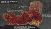 Overview showing a timeline of the Palisades Fire spread, the areas affected, and some information about the event.