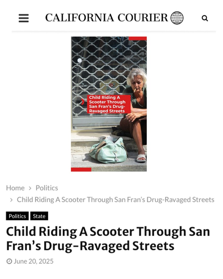 A reader who clicked through to the Courier’s website would find stories that largely align with a conservative view of the news, like a video of a child “riding a scooter through San Fran’s drug-ravaged streets,” or an anonymous piece that cites “confidential sources” cautioning against a “left-wing educator” running for a position with an Orange County school district.