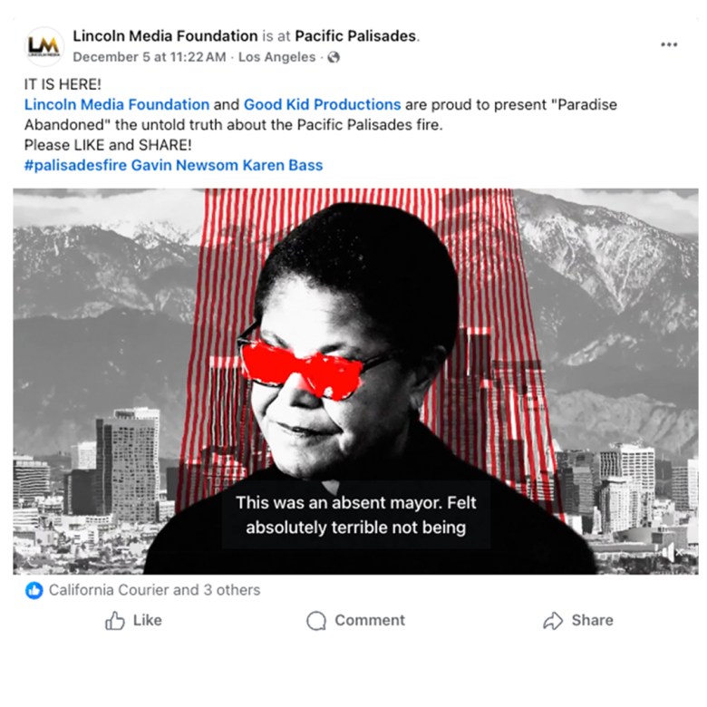 The Lincoln Media Foundation’s Facebook page recently said it was “proud to present” a new documentary purporting to reveal “the untold truth about the Pacific Palisades fire,” the natural disaster that tore through the state this year and increased political pressure on Newsom.