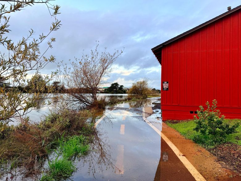 Floodwater left parts of the Berkeley Marina and surrounding area submerged on Jan. 5, 2026, but some blue skies in the morning teased the sunny weather forecast for the rest of the week. Credit: Sonia L. Pang