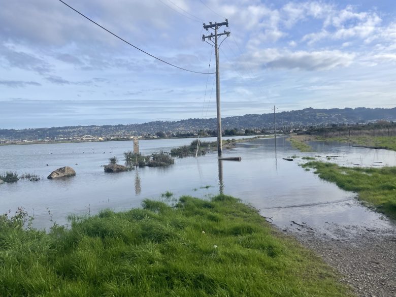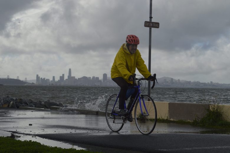 A cyclist braves a waterlogged path along Berkeley’s waterfront on Jan. 3, 2026. p.m. Credit: Bentham Paulos