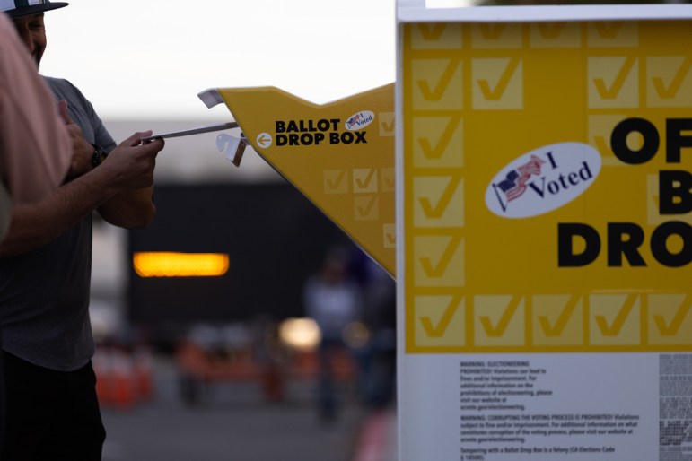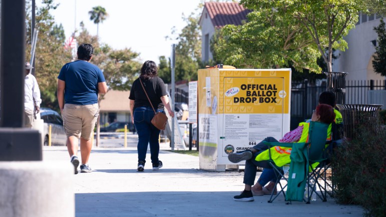 Anaheim residents walk away from a ballet box at the Ponderosa Community Center, having just submitted their voting forms on Tuesday, June, 2022. Credit: DEVON JAMES, Voice of OC