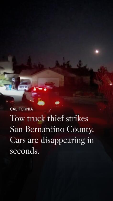 The tow truck driver stopped in front of the car, latched on using a self-loading lift and drove away without ever leaving the truck. The theft of Roller’s car is part of a pattern in which vehicles have been snatched from driveways and neighborhood curbs across San Bernardino County, stretching back for nearly a year.