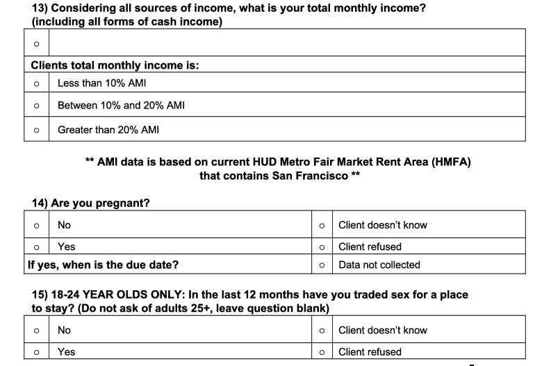 Questions 13, 14, and 15 from the coordinated entry questionnaire: What is your total monthly income? Are you pregnant? Have you traded sex for a place to stay?