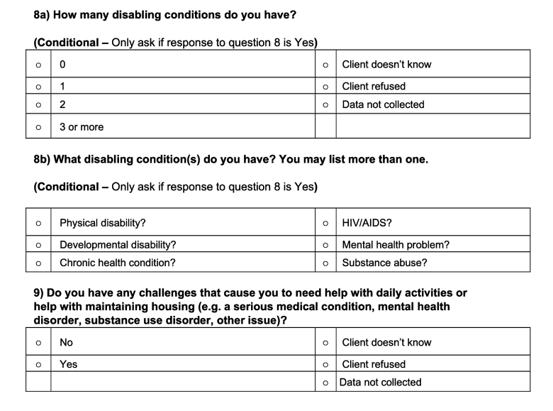 These three questions from the coordinated entry questionnaire ask participants about disabilities.