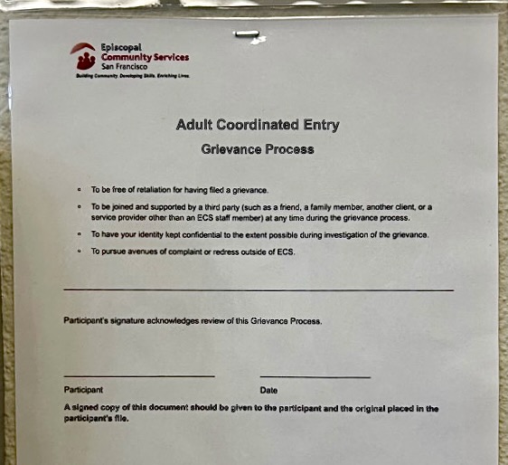One part of the form that participants in coordinated entry fill out to file a grievance. This version was posted inside ECS’s 10th St. access point. (Photo: Ayla Burnett)