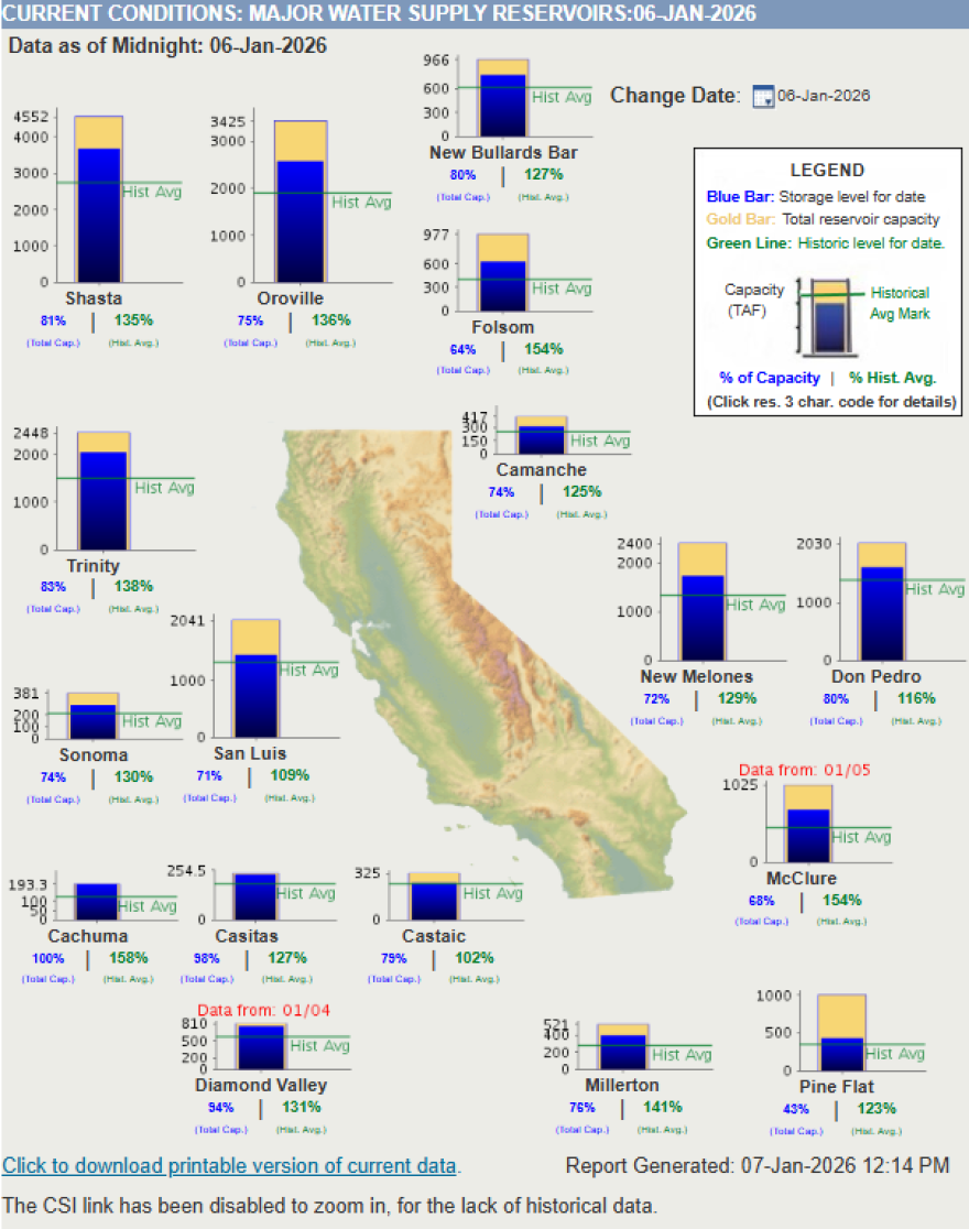 According to the DWR, the water levels at some of the major reservoirs in central California are all above average. That includes Pine Flat, Millerton, and San Luis reservoirs.