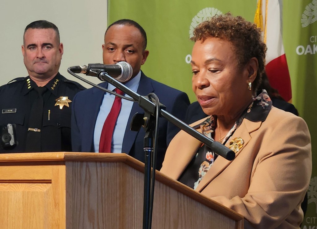 Oakland Mayor Barbara Lee touts the city’s double-digit reduction in crime rates for 2025, but said gun violence remains a challenge. “And yes, of course, I would like to eliminate it, like all of you,” she said. (Kiley Russell/Bay City News)