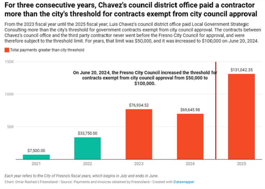 Their July 2024 contract never appeared before the Fresno City Council for approval, even though payments to the consulting company were not only greater than the initial contracted amount, but also greater than the approval threshold for government contracts exempt from city council approval.