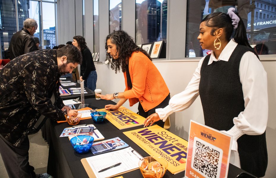 Maranda Saling, center, and Chloe Young, right, staffers for Senator Scott Wiener, assist an attendee at the candidate forum. Photo by Mariana Garcia.