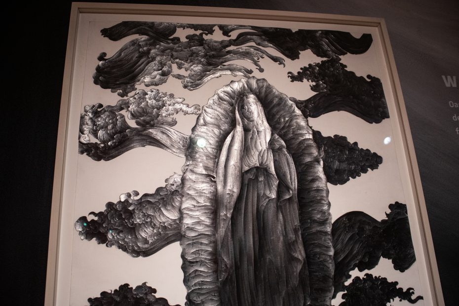 “Black Power Waves” by Oasa DuVerney uses graphite to depict the Virgin of Guadalupe at the Museum of African Design on Jan. 9, 2026. Photo by Mariana Garcia.