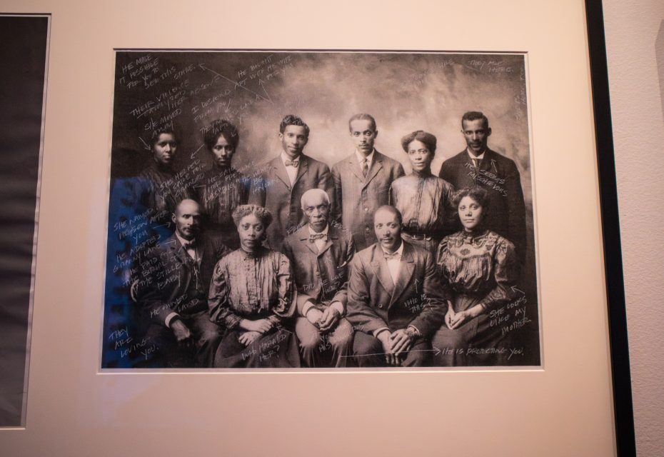 M. Carmen Lane’s “Masquerade I and Masquerade II” features a photograph of Lane’s family with commentary on each relative at the Museum of African Diaspora on Jan. 8, 2026. Photo by Mariana Garcia.
