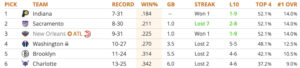 Those odds (52.1% & 14.0%) remain identical for the three worst records in the league, while the fourth-worst record has a 48% chance of landing in the top four and a 12.5% chance of winning the lottery.