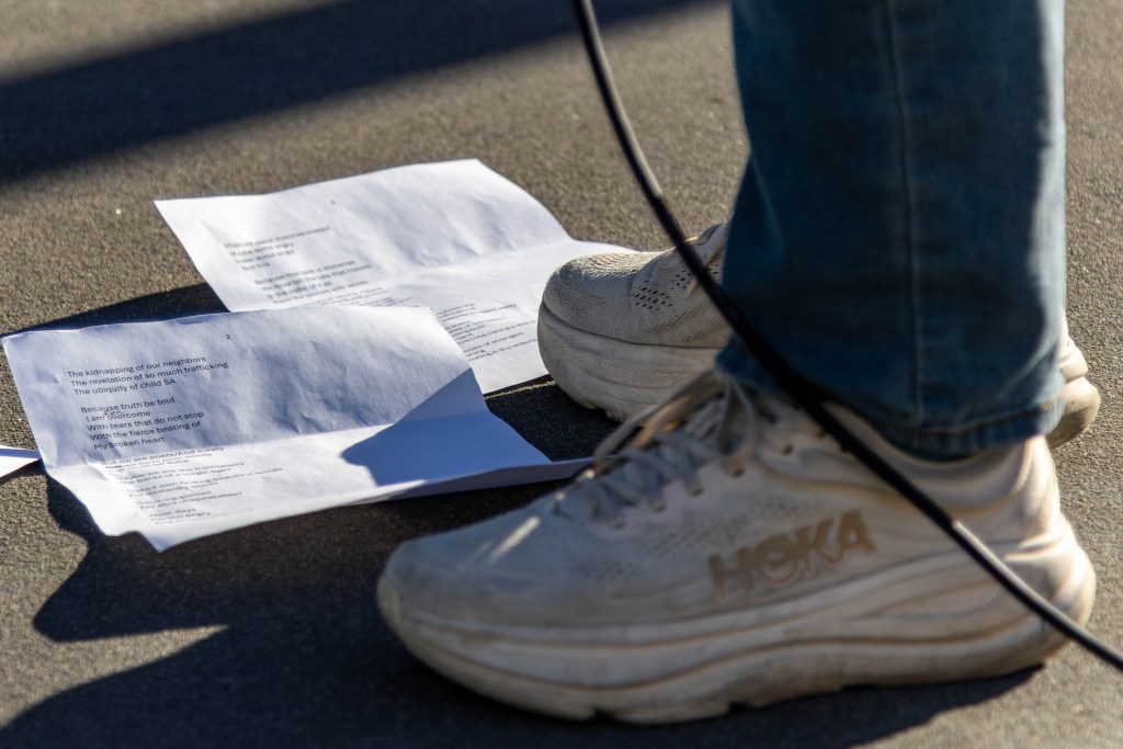 Long Beach’s National Day of Action protest had multiple speakers talk with the crowds on Jan. 10, 2026 at 2 p.m., one of which was a poet and as she preformed her poetry for the crowd, she’d drop the papers on the floor. (Samuel Chacko | Signal Tribune)